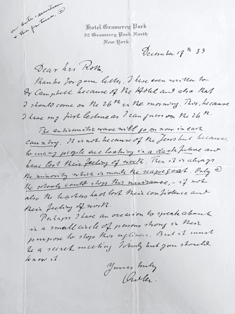 Adler äußerst sich besorgt über Lage und Zukunft Europas, verfasst am 17. Dezember 1933 im Hotel Gramercy Park, New York City.